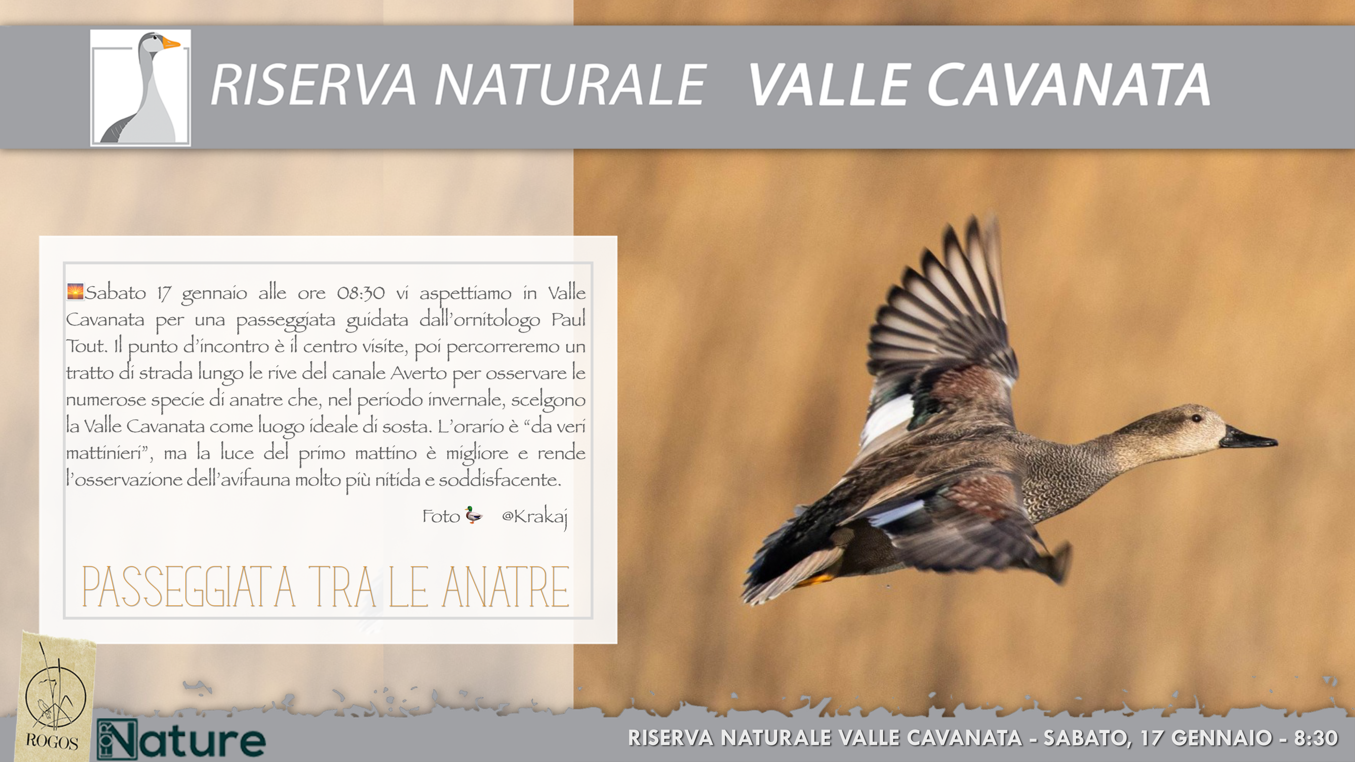 Riserva naturale Valle Cavanata via Grado 1, Fossalon di Grado, Italia🌅V soboto, 24. januarja, ob 8.30 vas čakamo v dolini Valle Cavanata na sprehod, ki ga bo vodil ornitolog Paul Tout. Zbirno mesto je obiskovalski center, od koder se bomo odpravili po poti ob bregovih kanala Averto, da bi opazovali številne vrste rac, ki v zimskem času izberejo dolino Valle Cavanata kot idealno mesto za […]